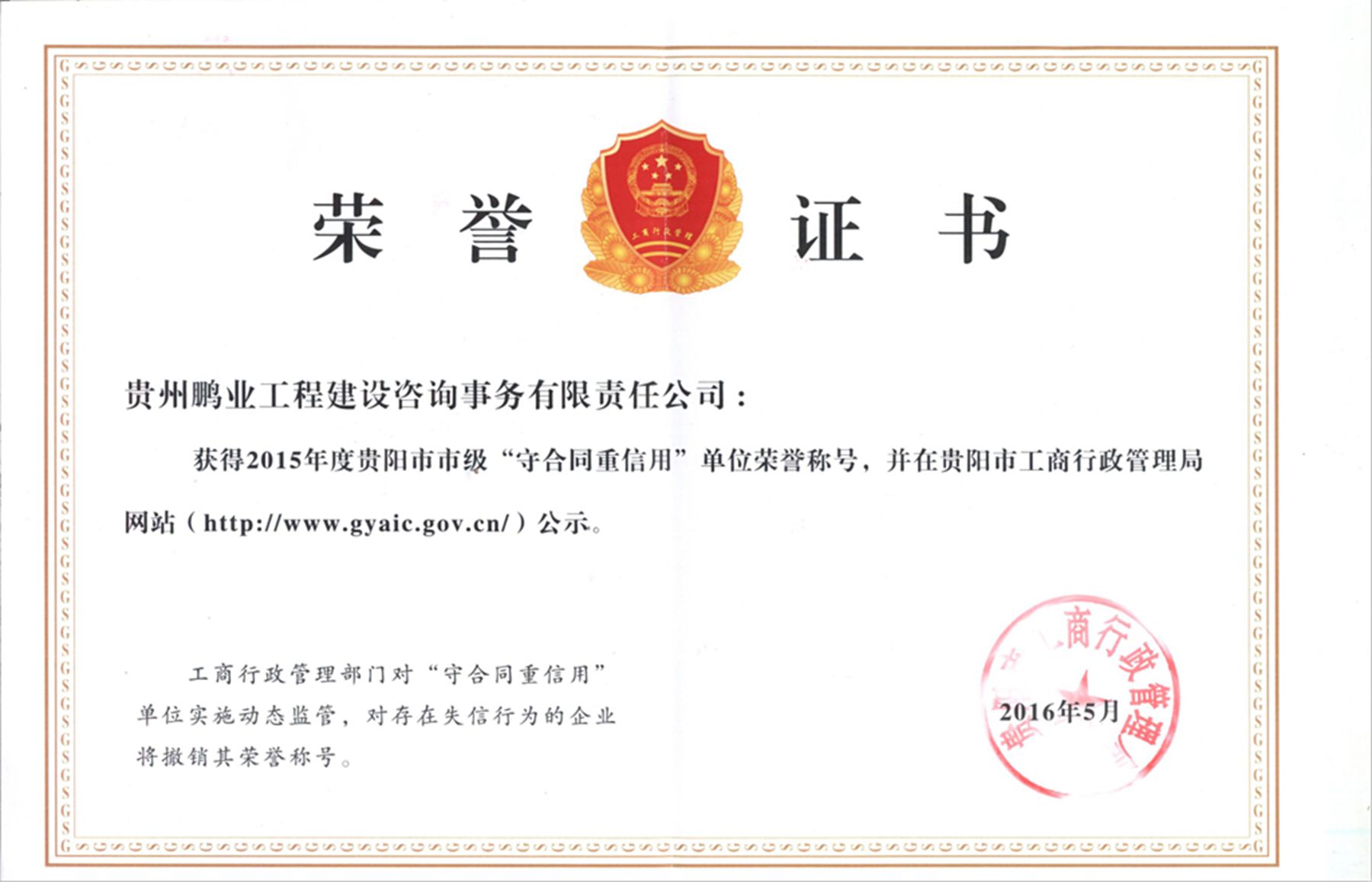 榮獲2015年度貴陽市市級“守合同重信用”榮譽稱號